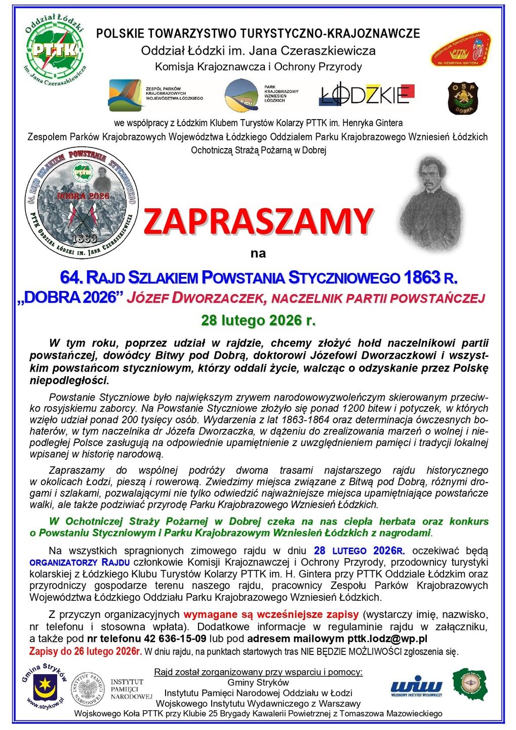Zapraszamy do wspólnej podróży dwiema trasami najstarszego rajdu historycznego w okolicach Łodzi – pieszą i rowerową. Zwiedzimy miejsca związane z Bitwą pod Dobrą, różnymi drogami i szlakami, pozwalającymi nie tylko odwiedzić najważniejsze miejsca upamiętniające powstańcze walki, ale także podziwiać przyrodę Parku Krajobrazowego Wzniesień Łódzkich.