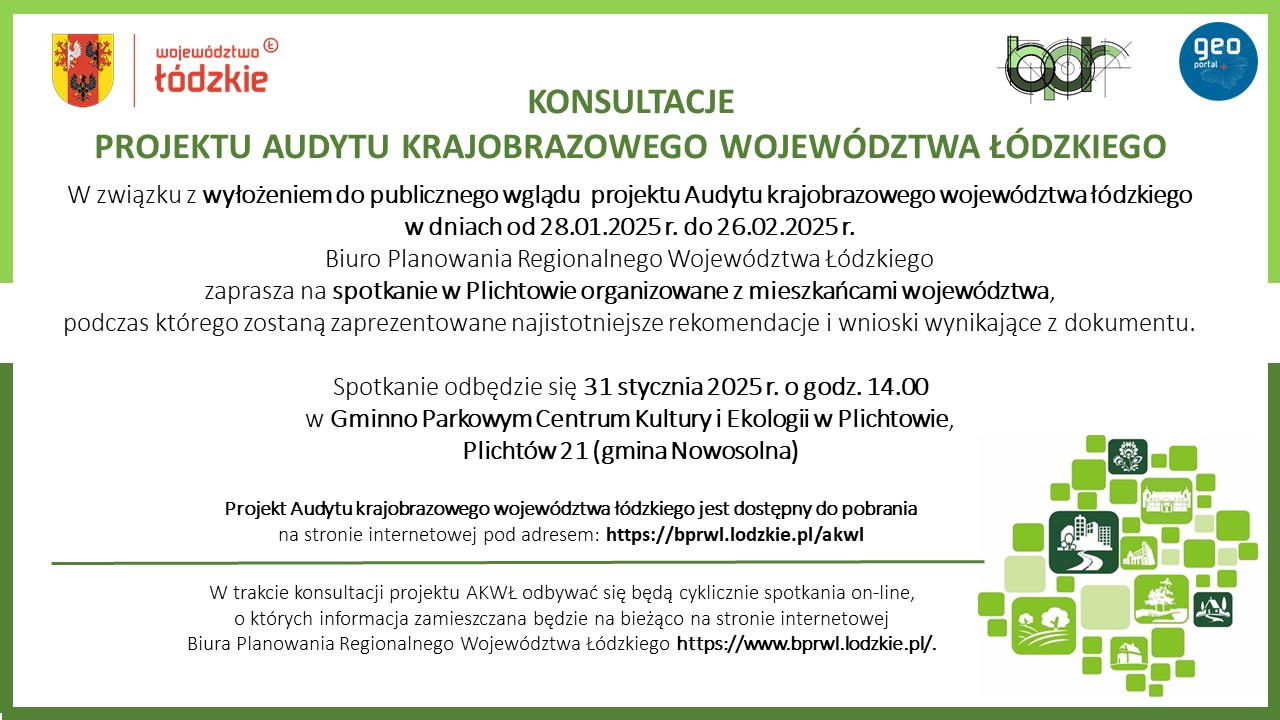 W dniu 31.01.2025 r. o godz. 14.00 w Gminno Parkowym Centrum Kultury i Ekologii w Plichtowie odbyło się spotkanie z mieszkańcami województwa w związku z wyłożeniem do publicznego wglądu projektu Audytu krajobrazowego województwa łódzkiego.